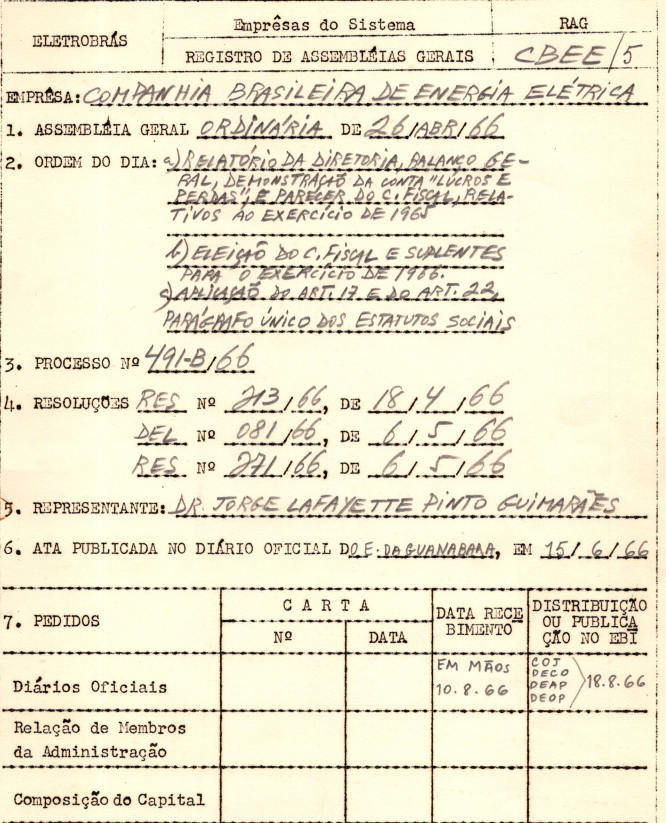 Registro da Assembleia da Companhia Brasileira de Energia Elétrica de abril de 1966