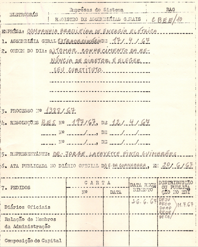 Documentos referentes à Assembleia Geral Extraordinária da Companhia Brasileira de Energia Elétrica - CBEE, realizada em 17 de abril de 1967, tendo como ordem do dia tomar conhecimento da renúncia do Diretor Léo Amaral Penna e eleger substituto.