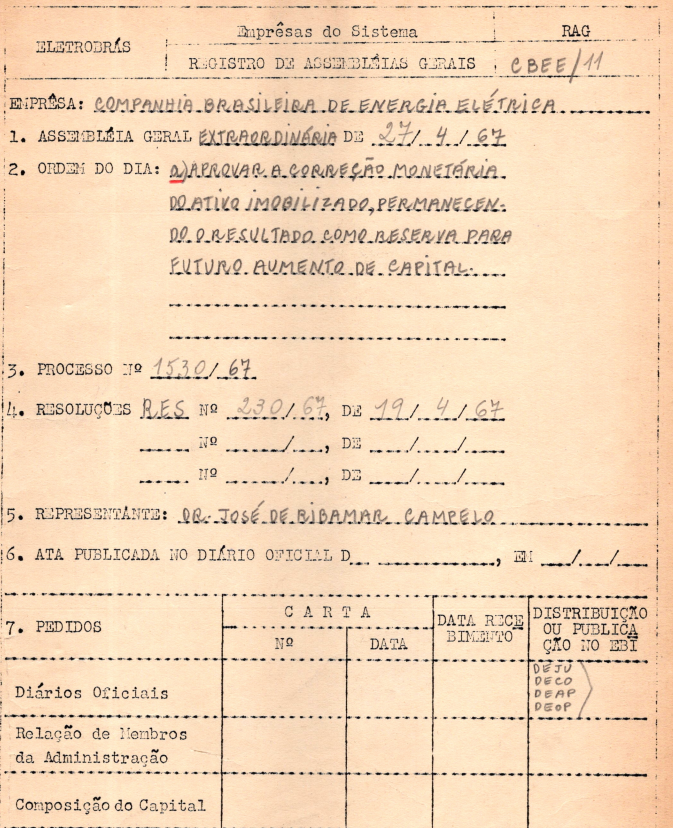 Documentos referentes à Assembleia Geral Extraordinária da Companhia Brasileira de Energia Elétrica - CBEE, realizada em 27 de abril de 1967, tendo como ordem do dia aprovar a correção monetária do ativo imobilizado.