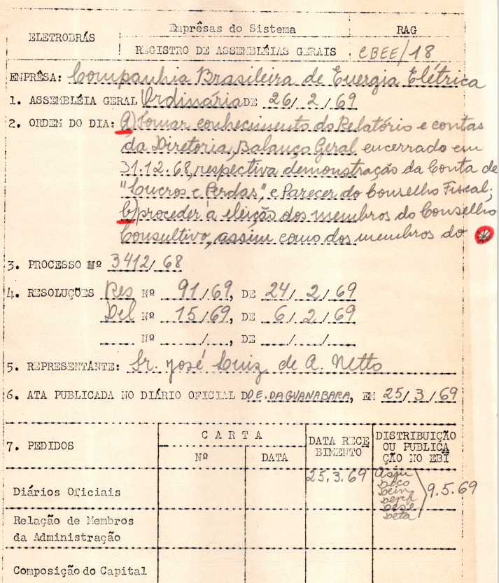 Documentos referentes à Assembleia Geral Ordinária da Companhia Brasileira de Energia Elétrica - CBEE, realizada em 26 de fevereiro de 1969, tendo como ordem do dia tomar conhecimento do Relatório e contas da Diretoria, eleição de membros do Conselho Consultivo e Fiscal, deliberar sobre fixação de verba destinada à remuneração da Diretoria e deliberar sobre preceitos estatutários relativos à aplicação dos Lucros Líquidos.