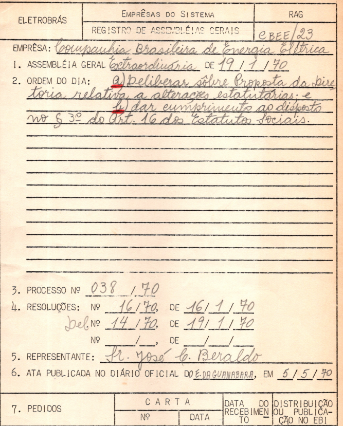 Registro da Assembleia Geral Extraordinária da CBEE de janeiro de 1970