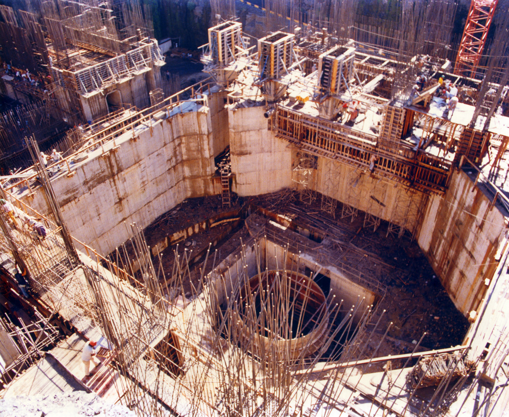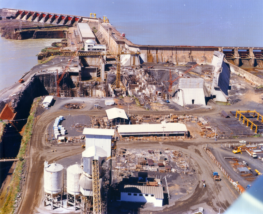 Conjunto fotográfico referente a construção da quarta etapa da Usina Hidrelétrica Cachoeira Dourada, apresentando imagens das escavações da casa de força, do poço da turbina, vista geral das obras e vista aérea da usina construída.