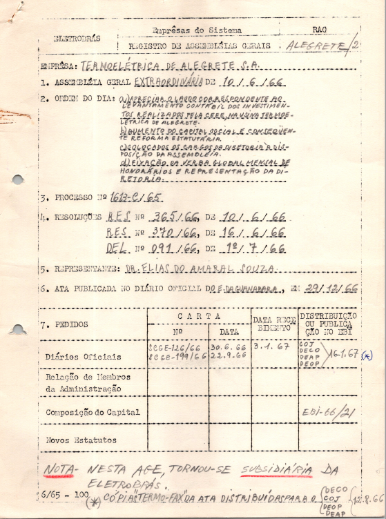 Documentos referentes à Assembleia Geral Extraordinária da Termelétrica Alegrete S.A, realizada em 10 de junho de 1965, tendo como ordem do dia o laudo do levantamento contábil dos investimentos realizados pela CEEE na Usina Termelétrica de Alegrete, o aumento do capital social e reforma estatutária, colocação de cargos da diretoria à disposição, fixação da verba global mensal de honorários e representação da diretoria. Possui pauta da reunião, enviada a Elias do Amaral Souza, representante da Eletrobras.