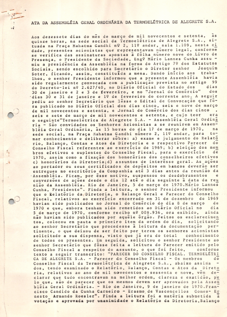 Documentos referentes à Assembleia Geral Extraordinária da Termelétrica Alegrete S.A, realizada em17 de março de 1970, tendo como ordem do dia a avaliação do relatório de contas e atos da diretoria, parecer do conselho fiscal referente ao exercício de 1969, eleição dos membros efetivos e suplentes do conselho fiscal para 1970 e fixação dos honorários dos conselheiros efetivos e outros assuntos de interesse da companhia. Possui pauta da reunião, enviada a José Augusto Vieira de Carvalho, representante da Eletrobras.