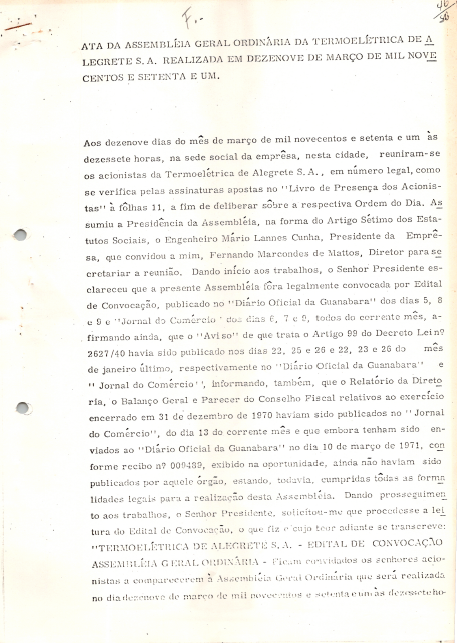 Documentos referentes à Assembleia Geral Ordinária da Termelétrica Alegrete S.A, realizada em 19 de março de 1971, tendo como ordem do dia o relatório da diretoria, do balanço geral e na demonstração da conta de lucros e perdas, parecer do conselho fiscal referente ao exercício de 1970, eleição dos membros do conselho fiscal e fixação dos honorários da diretoria e do conselho fiscal. Possui pauta da reunião, enviada a Gabriel Roberto Capistrano Costa e Silva, representante da Eletrobras.