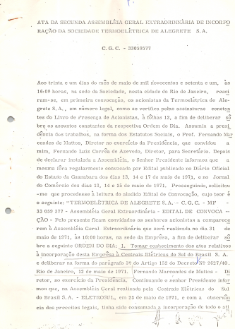 Documentos referentes à Assembleia Geral Ordinária da Termelétrica Alegrete S.A, realizada e 31 de maio de 1971, tendo como ordem do dia tomar conhecimento dos atos relativos à incorporação da Alegrete à Eletrosul e deliberar na forma do parágrafo 3º do artigo 152 do decreto nº 2627/40. Possui pauta da reunião, enviada a José Augusto Vieira de Carvalho, representante da Eletrobras.