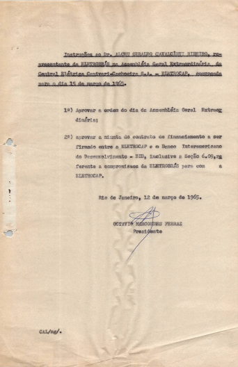 Documentos referentes à Assembleia Geral Ordinária da Central Elétrica Capivari - Cachoeira (Eletrocap), realizada em 15 de março de 1965, tendo como ordem do dia a aprovação da minuta do contrato de financiamento a ser firmado entre a Eletrocap e o Banco Interamericano de Desenvolvimento - BID, inclusive a seção 6.09, referente a compromissos da Eletrobras para com a Eletrocap. Possui pauta da reunião, enviada a Alceu Geraldo Cavalcânti Ribeiro, representante da Eletrobras.