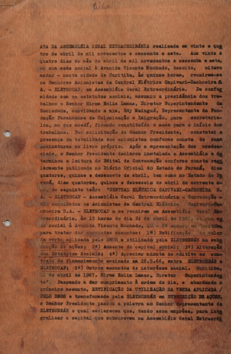 Documentos referentes à Assembleia Geral Extraordinária da Central Elétrica Capivari - Cachoeira (Eletrocap), realizada em 24 de abril de 1967, tendo como ordem do dia a retificação do valor da verba aplicada pelo DNOS e utilizada pela Eletrobras na subscrição de ações, o aumento do capital social, a apreciação da minuta do aditivo ao contrato de financiamento assinado em 28/05/1966, entre a Eletrobras e a Eletrocap e outros assuntos de interesse da companhia. Possui pauta da reunião, enviada a Maurício Schulman, representante da Eletrobras.