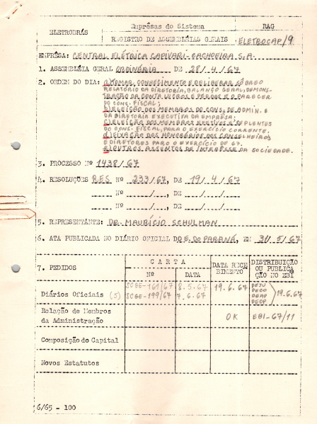Documentos referentes à Assembleia Geral Ordinária da Central Elétrica Capivari - Cachoeira (Eletrocap), realizada em 28 de abril de 1967, tendo como ordem do dia a aprovação do relatório da diretoria, balanço geral, demonstrativo da conta de lucros e perdas e parecer do conselho fiscal, relativos ao exercício de 1966, a indicação do engenheiro Nelson Luiz de Souza Pinto para integrar da diretoria executiva do conselho de administração da Eletrocap, acompanhar o voto dos demais acionistas da Eletrocap em relação à eleição dos outros membros da diretoria executiva e do conselho de administração, a indicação dos nomes do economistas José de Ribamar Campelo e José Coelho Rezende respectivamente como membros efetivo e suplente do conselho fiscal da Eletrocap, acompanhar o voto dos demais acionistas da Eletrocap quanto à eleição dos outros membros do conselho fiscal e à fixação dos honorários dos diretores e conselheiros para o exercício de 1967, e outros assuntos de interesse da companhia. Possui pauta da reunião, enviada a Maurício Schulman, representante da Eletrobras.