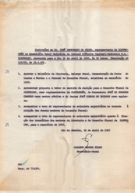 Documentos referentes à Assembleia Geral Ordinária da Central Elétrica Capivari - Cachoeira (Eletrocap), realizada em 28 de abril de 1968, tendo como ordem do dia a aprovação do relatório da diretoria, balanço geral, demonstração da conta de lucros e perdas e o parecer do conselho fiscal, relativos ao exercício de 1968, eleição dos membros efetivos e respectivos suplentes para o exercício corrente, fixação dos honorários dos conselheiros e diretores para o exercício de 1969, e outros assuntos de interesse da companhia. Possui pauta da reunião, enviada a José Esmeraldo da Silva, representante da Eletrobras.