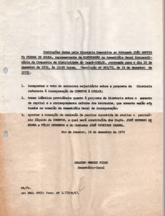 Documentos referentes à Assembleia Geral Extraordinária da Companhia de Eletricidade do Ceará - COELCE - ocorrida em 19 de dezembro de 1972, tendo como pauta acompanhar o voto do acionista majoritário sobre a proposta da diretoria referente à incorporação da Conefor à Coelce, tomar idêntica providência quanto à proposta da diretoria sobre o aumento de capital e a correspondente reforma dos estatutos, que somente serão efetuados na ocasião da Assembleia Geral de incorporação, aprovar a nomeação da comissão de peritos incumbida de avaliar o patrimônio líquido da Conefor, a qual será constituída dos engenheiros José Bezerra e Túlio Grinberg e do contador José Viveiros Cabral.