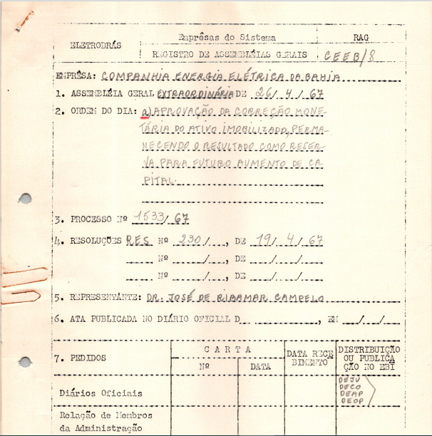 Documentos referentes à Assembleia Geral Extraordinária da Companhia Energia Elétrica da Bahia - CEEB - ocorrida em 26 de abril de 1967, tendo como pauta a correção monetária do ativo imobilizado.