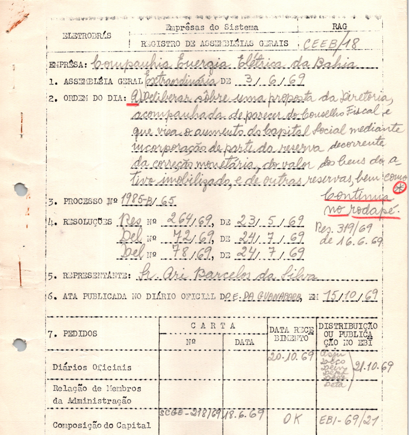 Documentos referentes à Assembleia Geral Extraordinária da Companhia Energia Elétrica da Bahia - CEEB - ocorrida em 03 de maio de 1969, tendo como pauta a deliberação sobre proposta da Diretoria, acompanhada do parecer do Conselho Fiscal, visando o aumento do capital social da empresa mediante correção monetária do valor do ativo imobilizado.