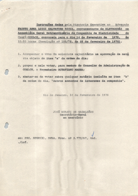 Documentos referentes à Assembleia Geral Extraordinária da Companhia de Eletricidade do Ceará - COELCE - ocorrida em 14 de fevereiro de 1978, tendo como pauta proposta da Diretoria, acompanhada de parecer do Conselho Fiscal, de adaptação do estatuto social aos preceitos da lei nº 6.404. de 15/12/1976 e outros assuntos de interesse da empresa.