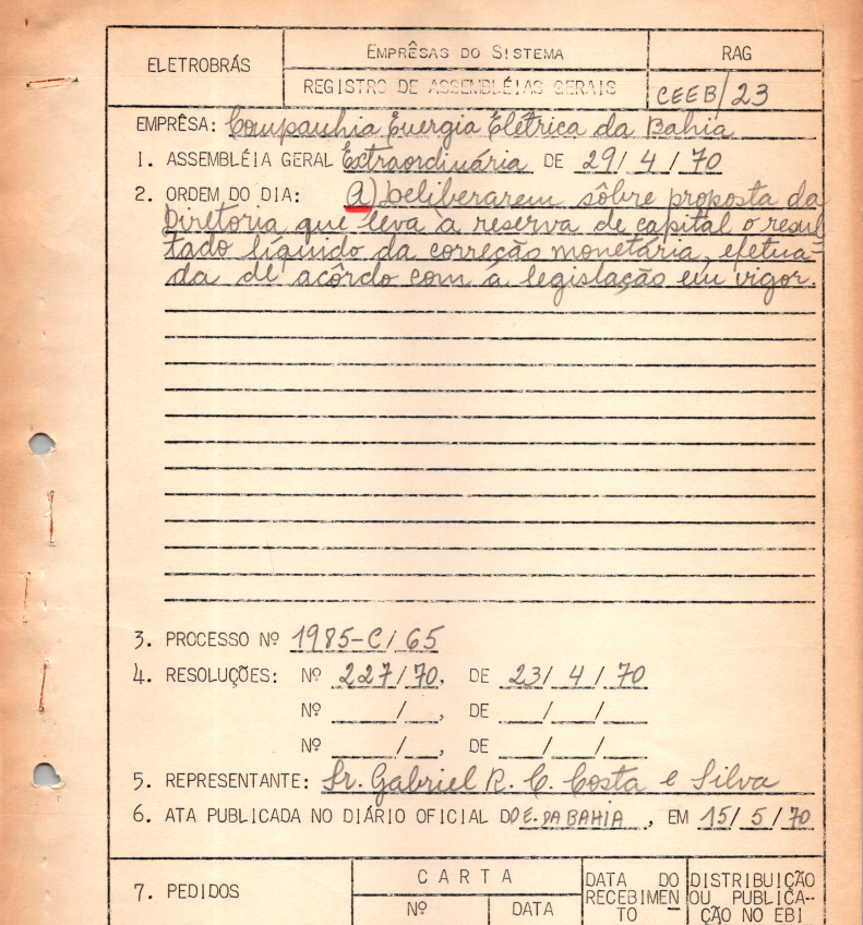 Documentos referentes à Assembleia Geral Extraordinária da Companhia Energia Elétrica da Bahia - CEEB - ocorrida em 29 de abril de 1970, tendo como pauta deliberar sobre a proposta da Diretoria que leva à reserva de capital o resultado líquido da correção monetária.
