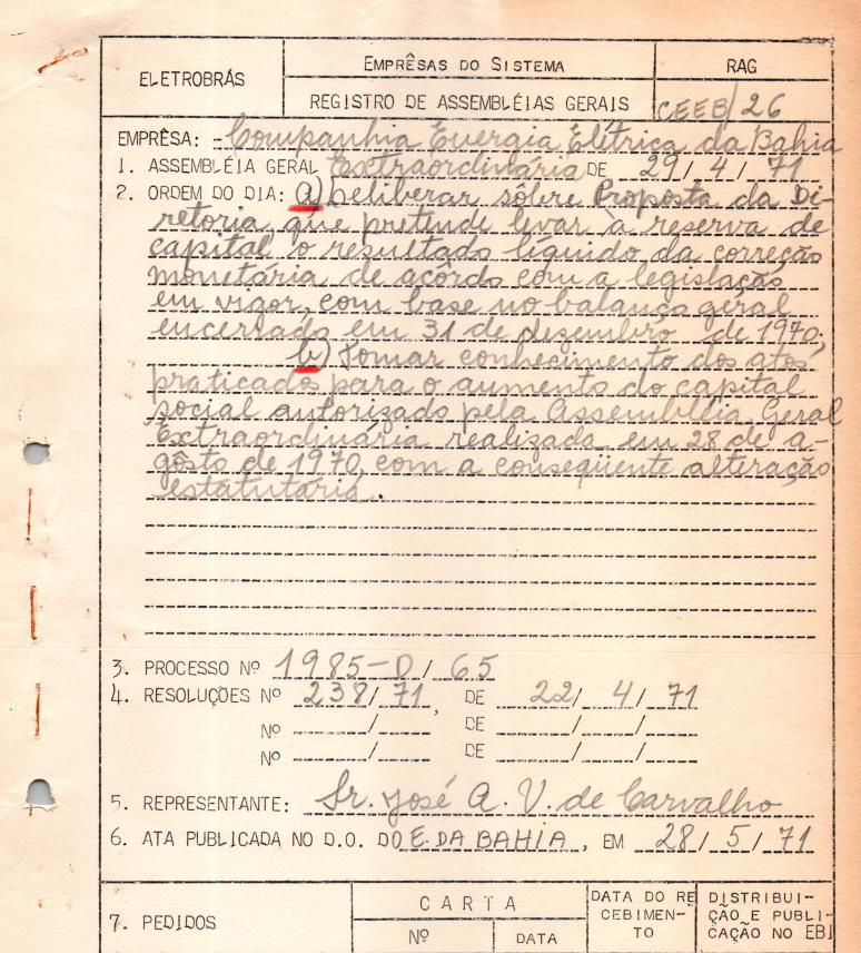 Documentos referentes à Assembleia Geral Ordinária da Companhia Energia Elétrica da Bahia - CEEB - ocorrida em 29 de abril de 1971, tendo como pauta deliberação sobre proposta da Diretoria sobre levar à reserva de capital o resultado líquido da correção monetária e aumento do capital social.
