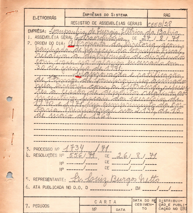Documentos referentes à Assembleia Geral Extraordinária da Companhia Energia Elétrica da Bahia - CEEB - ocorrida em 27 de agosto de 1971, tendo como pauta proposta da Diretoria, acompanhada do parecer do Conselho Fiscal, referente à distribuição dos dividendos e a ratificação de termos de compromisso assinados pela Diretoria.
