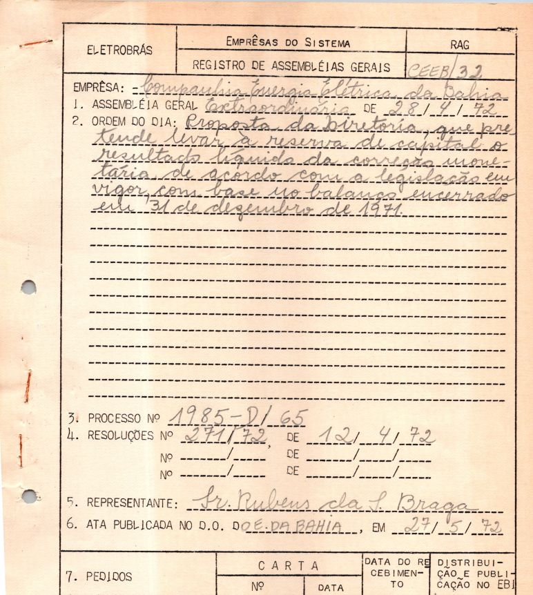 Documentos referentes à Assembleia Geral Extraordinária da Companhia Energia Elétrica da Bahia - CEEB - ocorrida em 28 de abril de 1972, tendo como pauta a proposta da Diretoria de levar à reserva de capital o resultado líquido da correção monetária.