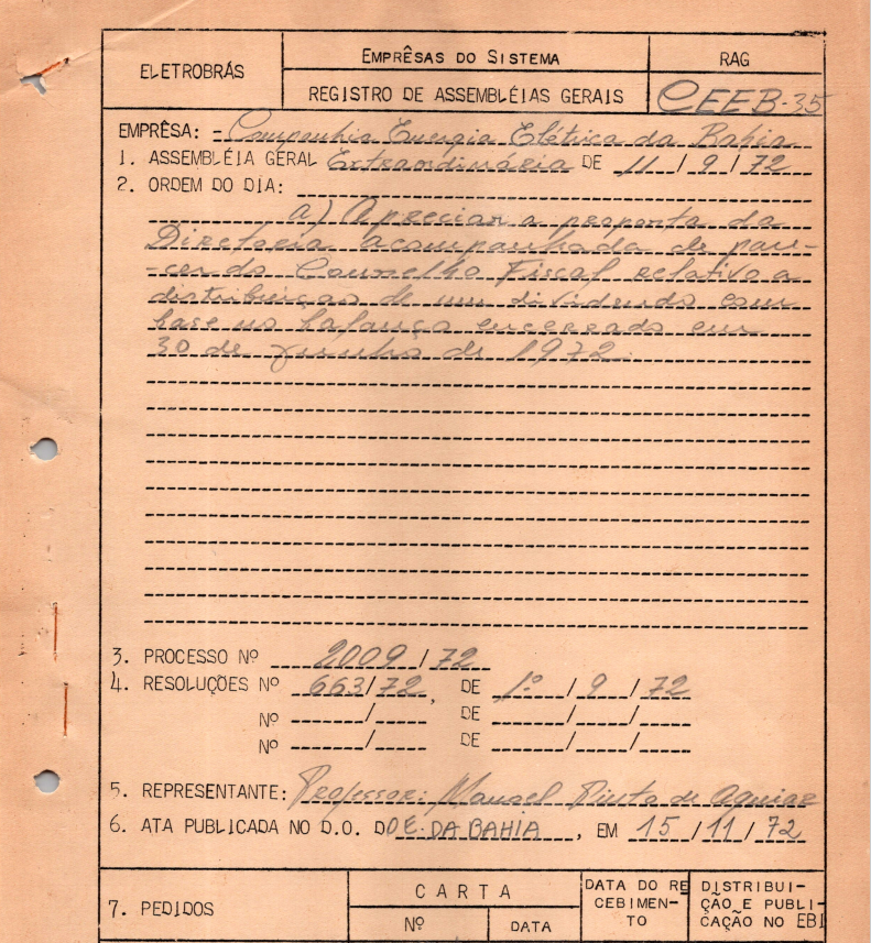 Documentos referentes à Assembleia Geral Extraordinária da Companhia Energia Elétrica da Bahia - CEEB - ocorrida em 11 de agosto de 1972, tendo como pauta tendo como pauta análise da proposta da Diretoria, acompanhada do parecer do Conselho Fiscal, referente à divisão dos dividendos.