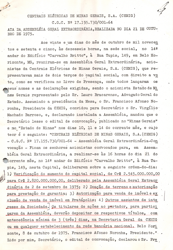 Documentos referentes à Assembleia Geral Extraordinária das Centrais Elétricas de Minas Gerais S.A. - CEMIG, empresa associada da Eletrobras, realizada em 21 de outubro de 1975, tendo como ordem do dia verificação do aumento do capital social, doação de terreno e autorização para prestação de garantia, autorização para venda de imóvel e exclusão de venda de imóvel em Pratápolis e outros assuntos de interesse da companhia.