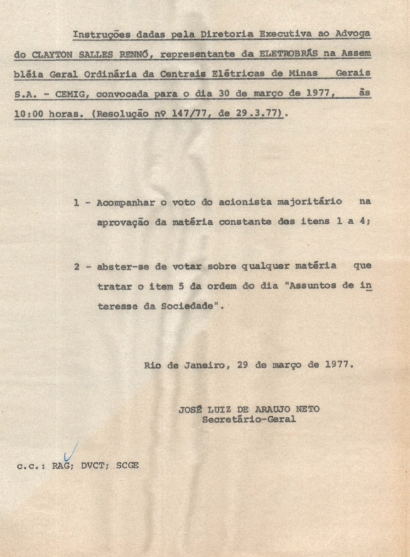 Documentos referentes à Assembleia Geral Ordinária das Centrais Elétricas de Minas Gerais S.A. - CEMIG, empresa associada da Eletrobras, realizada em 30 de março de 1977, tendo como ordem do dia discussão e votação do relatório da Diretoria, balanço geral, demonstração de conta de lucros e perdas com parecer do Conselho Fiscal relativos ao exercício de 1976, eleição do Conselho Fiscal e fixação de sua remuneração, eleição de membros do Conselho de Administração e fixação de sua remuneração, fixação dos honorários da Diretoria. Inclui pauta da referida Assembleia encaminhada a Clayton Salles Rennó, representante da Eletrobras.
