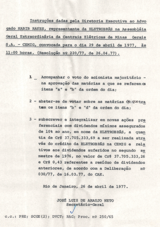Registros da Assembleia Geral Extraordinária da CEMIG de abril de 1977
