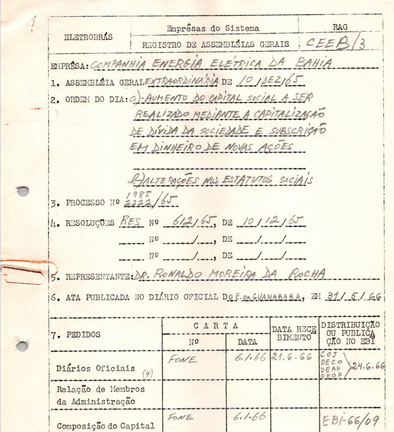Documentos relativos à Assembleia Geral Extraordinária da Companhia Energia Elétrica da Bahia - CEEB - ocorrida em 10/12/1965, tendo como pauta o aumento do capital social e alterações estatutárias.