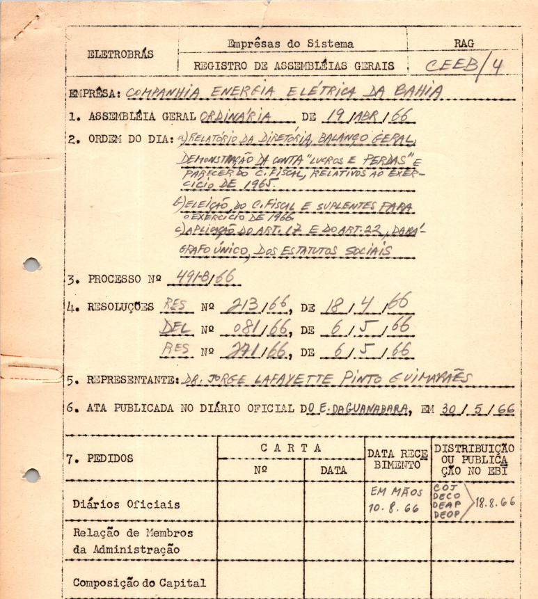Documentos referentes à Assembleia Geral Ordinária da Companhia Energia Elétrica da Bahia - CEEB - ocorrida em 19 de abril de 1966, tendo como pauta Relatório da Diretoria, Balanço Geral, Demonstração da conta de lucros e perdas e parecer do Conselho Fiscal, relativo ao exercício de 1966, eleição de Diretores do Conselho Fiscal e seus suplentes.