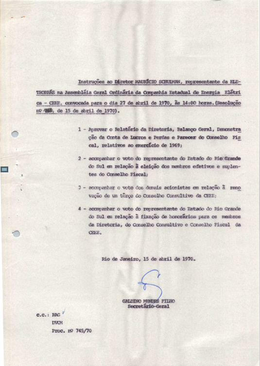 Documentos referentes à Assembleia Geral Ordinária da Companhia Estadual de Energia Elétrica - CEEE, realizada em 27 de abril de 1970, tendo como ordem do dia a aprovação do relatório da diretoria, balanço geral, demonstração da conta de lucros e perdas do conselho fiscal, relativos ao exercício de 1969, acompanhamento do voto do representante do Estado do Rio Grande do Sul em relação à eleição dos membros efetivos e suplentes do conselho fiscal, bem com em relação à fixação de honorários para os membros da diretoria, do conselho consultivo e conselho fiscal da CEEE, acompanhamento do voto dos demais acionistas em relação à renovação de um terço do conselho consultivo da CEEE. Inclui pauta da referida Assembleia enviada a Maurício Schulman, representante da Eletrobras.