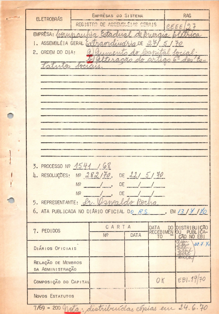 Registro da Assembleia Geral Extraordinária da CEEE de maio de 1970