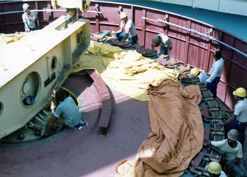 04 Hall de montagem - pré-montagem do mancal de escora da unidade III - jan./89.