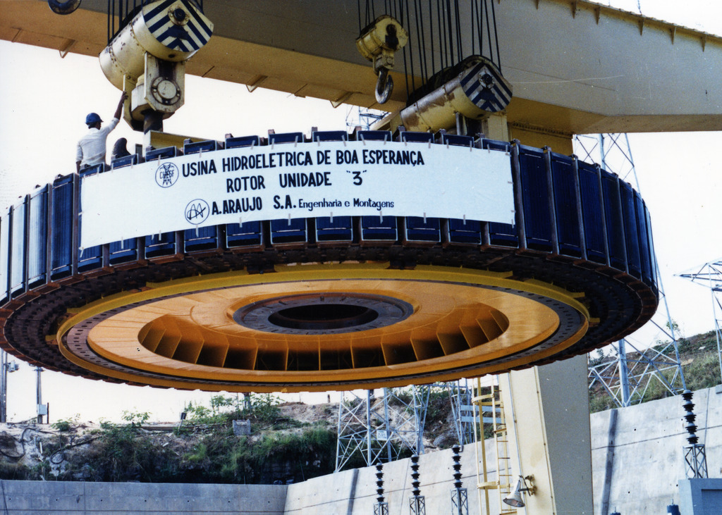 Conjunto com 76 fotografias referentes as obras de ampliação na Usina Hidrelétrica Boa Esperança, apresentando imagens das obras na casa de máquinas, na subestação, no local de fuga e trabalho na área de montagem.