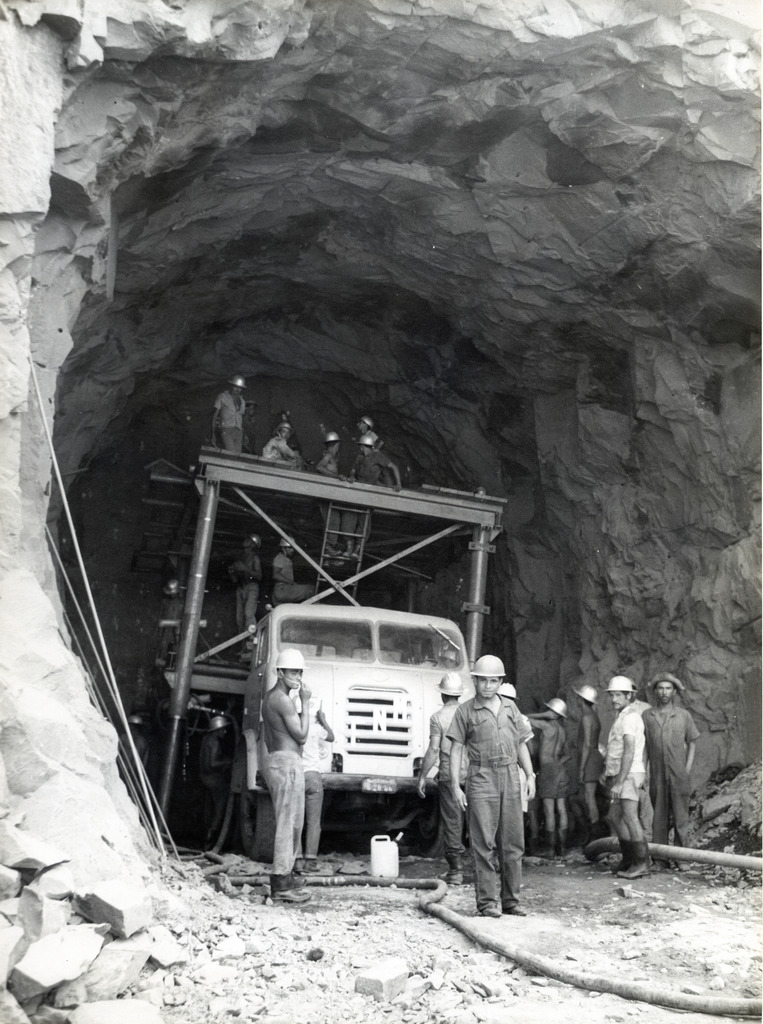 Conjunto fotográfico da construção da Usina Hidrelétrica Boa Esperança, apresentando imagens das obras iniciais na barragem auxiliar, no canal de acesso, no trecho principal e no túnel do canal de fuga.