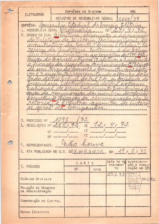 Documento referente à Assembleia Geral Extraordinária da Companhia Estadual de Energia Elétrica - CEEE, realizada em 27 de abril de 1972, tendo como ordem do dia a leitura, discussão e apreciação do relatório da diretoria, balanço geral, demonstrativo da conta de lucros e perdas, pareceres da auditoria externa e do conselho fiscal, relativos ao exercício de 1971, eleição do conselho fiscal, eleição de um terço do conselho consultivo, efetivos e suplentes representando o Banco do Estado do Rio Grande do Sul S.A., a Sociedade de Engenharia do Rio Grande do Sul S.A. e o Banco Nacional de Desenvolvimento Econômico e fixação da remuneração dos membros referidos do conselho, fixação da remuneração da diretoria e outros assuntos de interesse da companhia.