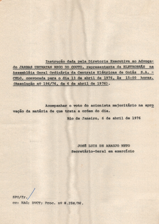 Documentos referentes à Assembleia Geral Ordinária das Centrais Elétricas de Goiás S.A. - CELG - ocorrida em 13 de abril de 1976, tendo como ordem do dia deliberar sobre o relatório, o balanço e a conta de lucros e perdas referentes ao exercício de 1975, apresentado pela Diretoria, com o parecer do Conselho Fiscal, eleição do referido conselho, fixação dos honorários da Diretoria e da remuneração do Conselho Fiscal, além de deliberar sobre outros assuntos de interesse da empresa. Inclui pauta enviada a Jarbas Ubyratan Rêgo do Couto, representante da Eletrobras.