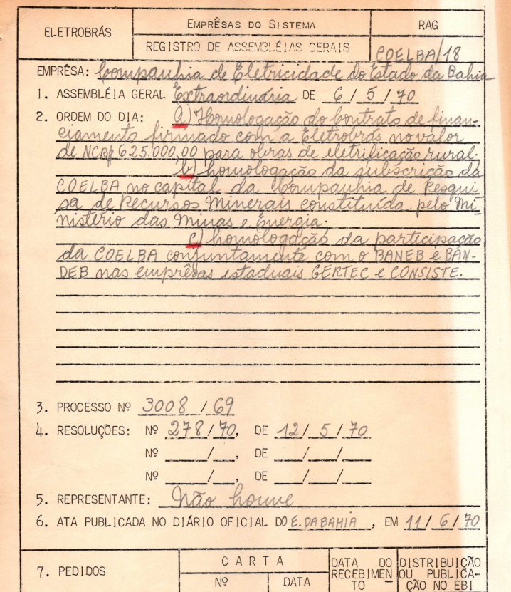 Documentos referentes à Assembleia Geral Extraordinária da Companhia de Eletricidade do Estado da Bahia - COELBA, empresa associada da Eletrobras, realizada em 06 de maio de 1970, tendo como ordem do dia a homologação do contrato de financiamento de projeto firmado com a Eletrobras, homologação da subscrição da COELBA no capital da Companhia de Pesquisa de Recursos Minerais do Ministério de Minas e Energia, homologação da participação da COELBA conjuntamente com o BANEB e BANDEB nas empresas estaduais GERTEC e CONSISTE.