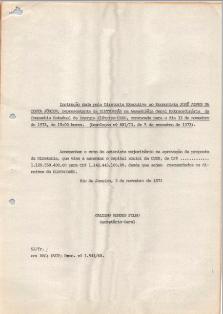 Documentos referentes à Assembleia Geral Extraordinária da Companhia Estadual de Energia Elétrica - CEEE, realizada em 13 de novembro de 1973, tendo como ordem do dia a leitura, discussão e aprovação do relatório da diretoria, balanço semestral, demonstrativo da conta de lucros e perdas, pareceres de auditoria externa e conselho fiscal, relativo ao 1º semestre de 1973 encerrado em 30/06/1973, o aumento do capital social de Cr$ 1.142.443.100,00 mediante subscrição de 128.927 ações de 100,00 cada uma com aproveitamento dos recursos, e alteração do artigo 6º dos estatutos sociais em virtude do aumento de capital. Inclui pauta da referida Assembleia enviada a José Alves da Costa Júnior, representante da Eletrobras.