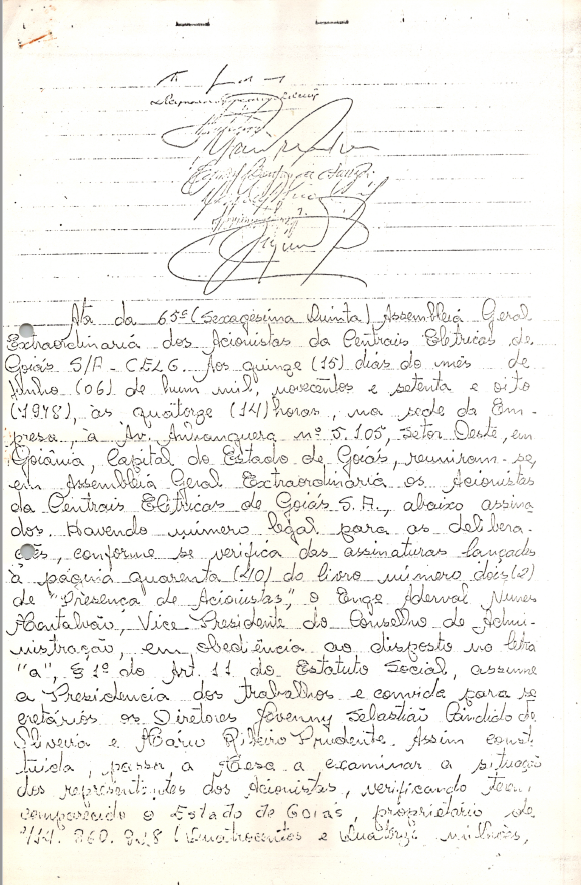 Documentos referentes à Assembleia Geral Extraordinária das Centrais Elétricas de Goiás S.A. - CELG - ocorrida em 15 de junho de 1978, que tinha como ordem do dia tomar conhecimento dos atos referentes a correção monetária especial do ativo imobilizado da empresa, deliberar sobre o aumento do capital social, sobre a alteração do estatuto social, eleição do presidente do Conselho de Administração da empresa e outros assuntos de interesse da mesma.