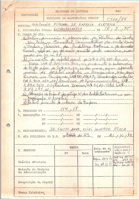Documentos referentes à Assembleia Geral Extraordinária da Companhia Estadual de Energia Elétrica - CEEE, realizada em 18 de setembro de 1975, tendo como ordem do dia o acompanhamento do voto do acionista majoritário na aprovação do relatório da diretoria, balanço semestral e demonstração da conta de lucros e perdas, levantados em 30 de junho de 1975, a proposta da diretoria que visa a elevação do capital social da CEEE; subscrever, em nome da Eletrobras, o referido aumento do capital, integralizando no ato, em ações preferenciais, a parcela Cr$ 6.903.300,00 equivalente a 69.033 ações do valor nominal de Cr$ 100,00 cada uma, a aprovação da alteração estatutária decorrente do citado aumento de capital, abstenção de voto sobre quaisquer matérias - que forem incluídas para deliberação no item da ordem do dia. Inclui pauta da referida Assembleia enviada a Fausto Anna Luigi Salvatore Ricca, representante da Eletrobras.