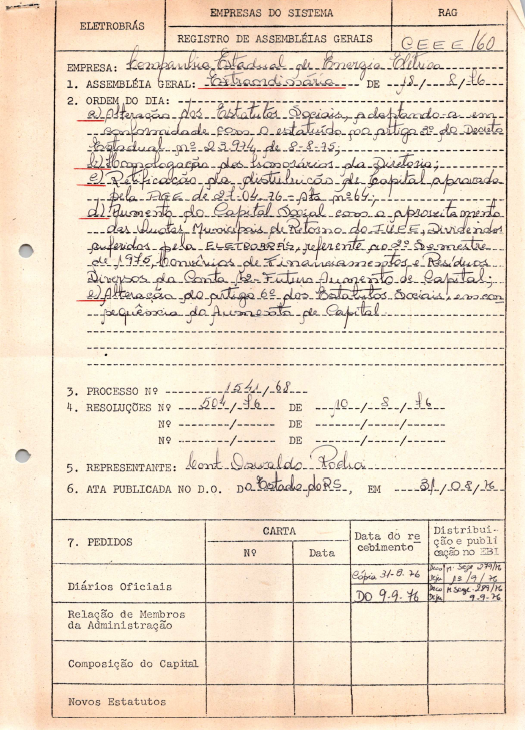 Documentos referentes à Assembleia Geral Extraordinária da Companhia Estadual de Energia Elétrica - CEEE, realizada em 18 de agosto de 1976, tendo como ordem do dia a alteração dos estatutos sociais, adaptando-a em conformidade com o estatuto, no artigo 3º do decreto estadual nº 23.974 de 08/08/1975, homologação dos honorários da diretoria, retificação da distribuição de capital aprovada pela AGE de 27/04/1976, ata nº 64, aumento do capital social com o aproveitamento das quotas municipais de retorno do INEE, dividendos aferidos pela Eletrobras, referente ao 2º semestre de 1975, convênios de financiamentos e resíduos diversos da conta, aumento de capital, alteração do artigo 6º dos estatutos sociais, em consequência do aumento de capital. Inclui pauta da referida Assembleia enviada a Oswaldo Rocha, representante da Eletrobras.