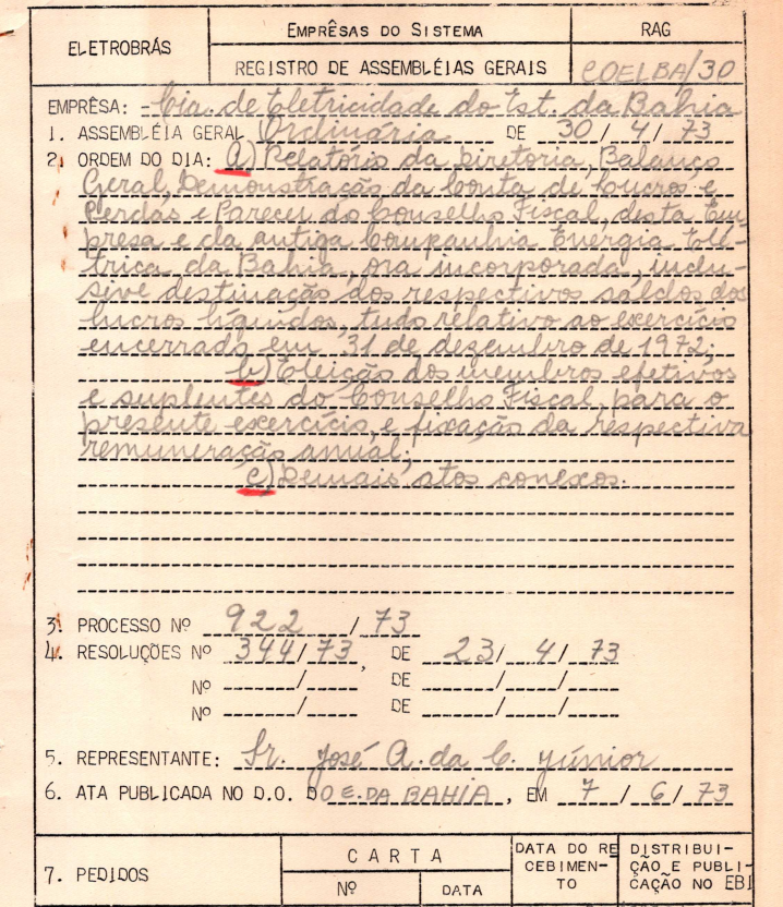 Documentos referentes à Assembleia Geral Ordinária da Companhia de Eletricidade do Estado da Bahia - COELBA, empresa associada da Eletrobras, realizada em 30 de abril de 1973, tendo como ordem do dia o Relatório da Diretoria, Balanço Geral, Demonstrativo da conta de lucros e perdas, Parecer do Conselho Fiscal e a eleição dos membros ao conselho fiscal.
