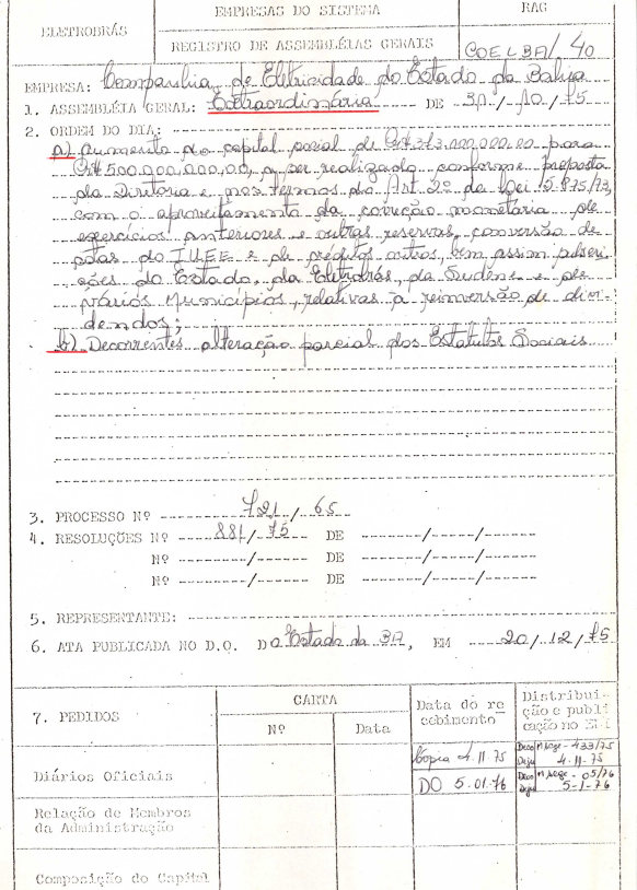 Registro da Assembleia Geral Extraordinária da COELBA de outubro de 1975