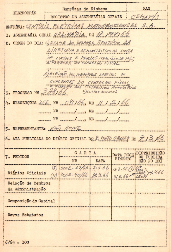 Documento referente ao registro da Assembleia Geral Ordinária das Centrais Elétricas Matogrossenses S.A. - CEMAT - ocorrida em 17 de fevereiro de 1966, tendo como ordem dia exame do balanço, relatório da Diretoria e demonstrativos da conta de lucros e perdas, referente a 1965, acompanhado do parecer do Conselho Fiscal, bem como eleição do referido conselho e fixação dos honorários, além de assuntos de interesse da empresa.