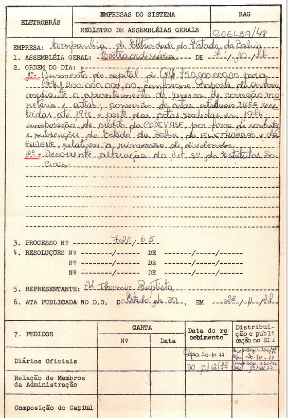 Registro da Assembleia Geral Extraordinária da COELBA de outubro de 1977