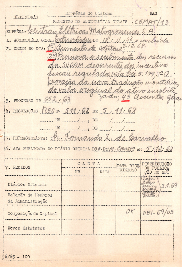 Registros da Assembleia Geral Extraordinária da CEMAT de novembro de 1968