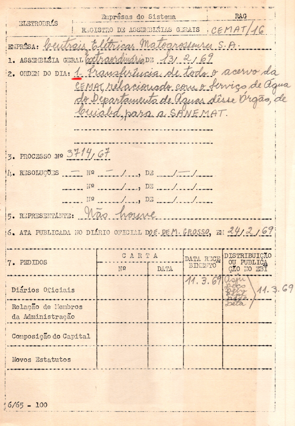 Documentos referentes à Assembleia Geral Extraordinária das Centrais Elétricas Matogrossenses S.A. - CEMAT - ocorrida em 13 de fevereiro de 1969, tendo como ordem do dia a transferência de todo o acervo da CEMAT, relacionado com serviço de água do Departamento de Águas do órgão, para a SANEMAT