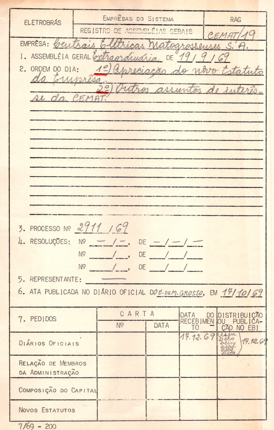 Documentos referentes à Assembleia Geral Extraordinária das Centrais Elétricas Matogrossenses S.A. - CEMAT - ocorrida em 19 de agosto de 1969, tendo como ordem do dia a apreciação do novo estatuto da empresa e outros assuntos de interesse da mesma