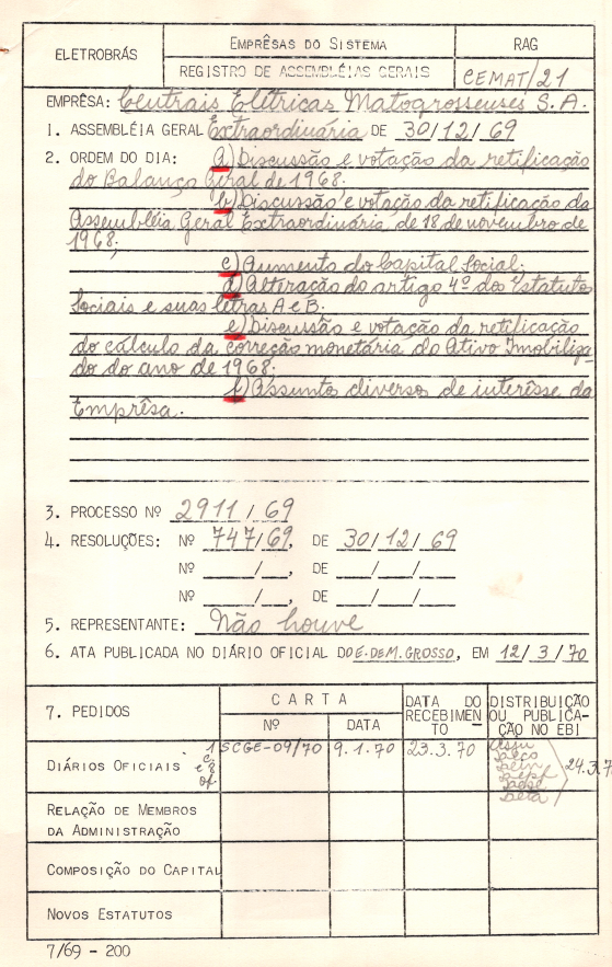 Documentos referentes à Assembleia Geral Extraordinária das Centrais Elétricas Matogrossenses S.A. - CEMAT - ocorrida em 30 de dezembro de 1969, tendo como ordem do dia discussão e votação da retificação do balanço geral de 1968, discussão e votação da retificação da Assembleia Geral Extraordinária de 18 de novembro de 1968, aumento do capital social; alteração estatutárias e outros assuntos de interesse da empresa.