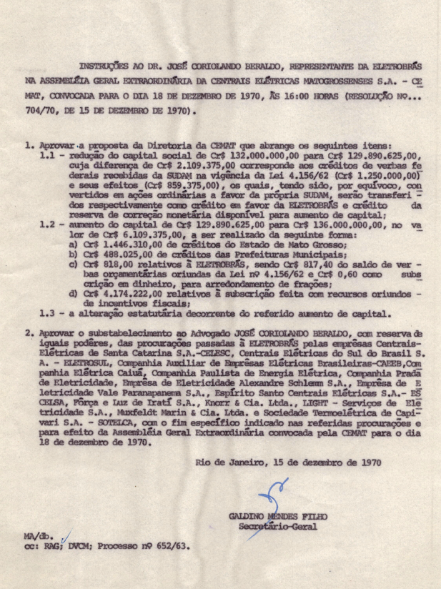 Documentos referentes à Assembleia Geral Extraordinária das Centrais Elétricas Matogrossenses S.A. - CEMAT - ocorrida em 18 de dezembro de 1970, tendo como ordem do dia a redução do capital, de conformidade com a deliberação constante na ata da Assembleia Geral Extraordinária de 13 de outubro de 1970, aumento do capital social, com recursos de incentivos fiscais do Decreto-Lei número 756, de 11 de agosto de 1969, reforma dos estatutos sociais e outros assuntos de interesse da empresa. Inclui pauta enviada a José Coriolando Beraldo, representante da Eletrobras.