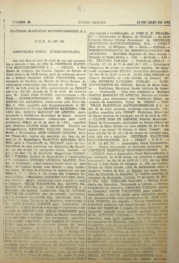 Documentos referentes à Assembleia Geral Extraordinária das Centrais Elétricas Matogrossenses S.A. - CEMAT - ocorrida em 06 de abril de 1971, tendo como ordem do dia eleição dos novos membros da Diretoria e outros assuntos de interesse da empresa.